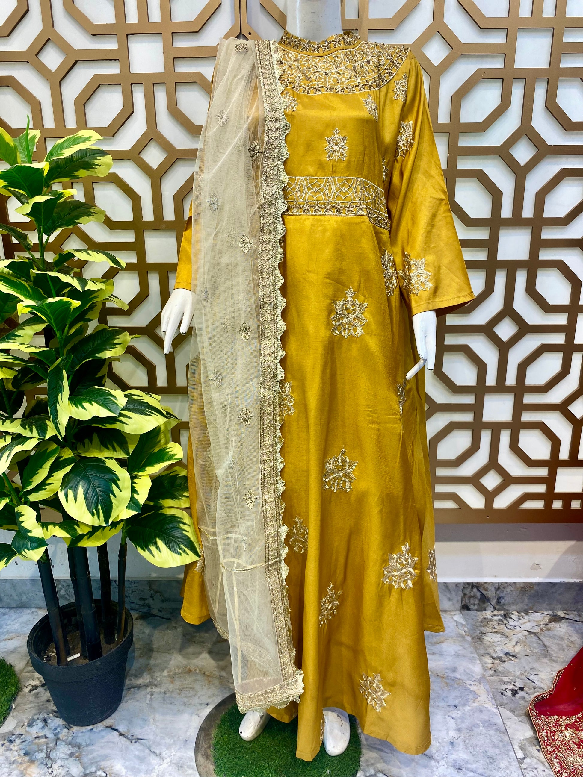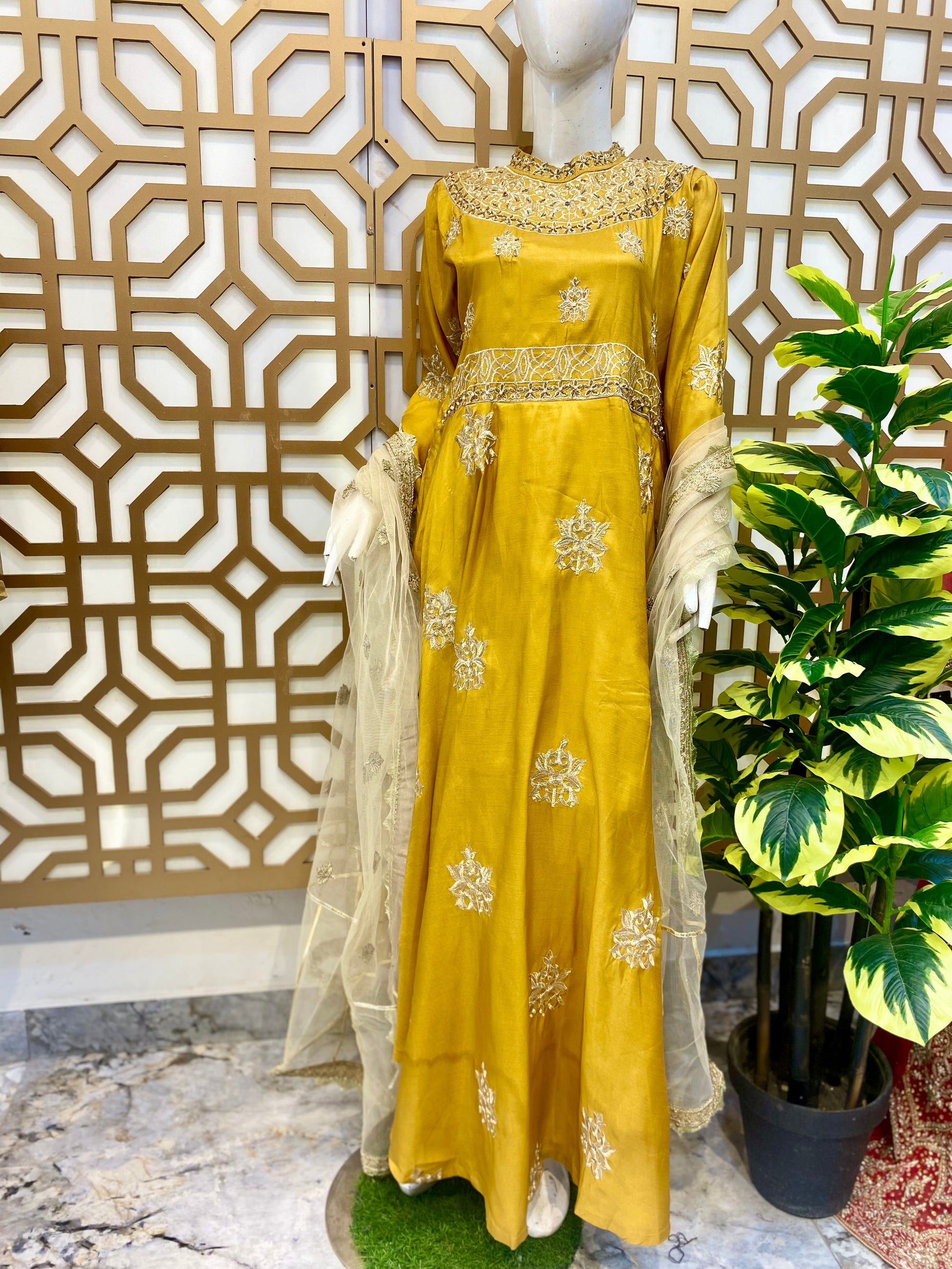 An elegant long frock beautifully adorned with delicate embroidery, creating a timeless and graceful look. The rich color enhances its sophistication, while the detailed embellishment adds a touch of festive charm. Perfect for weddings, parties, and formal occasions, this outfit strikes the perfect balance between classic and contemporary style