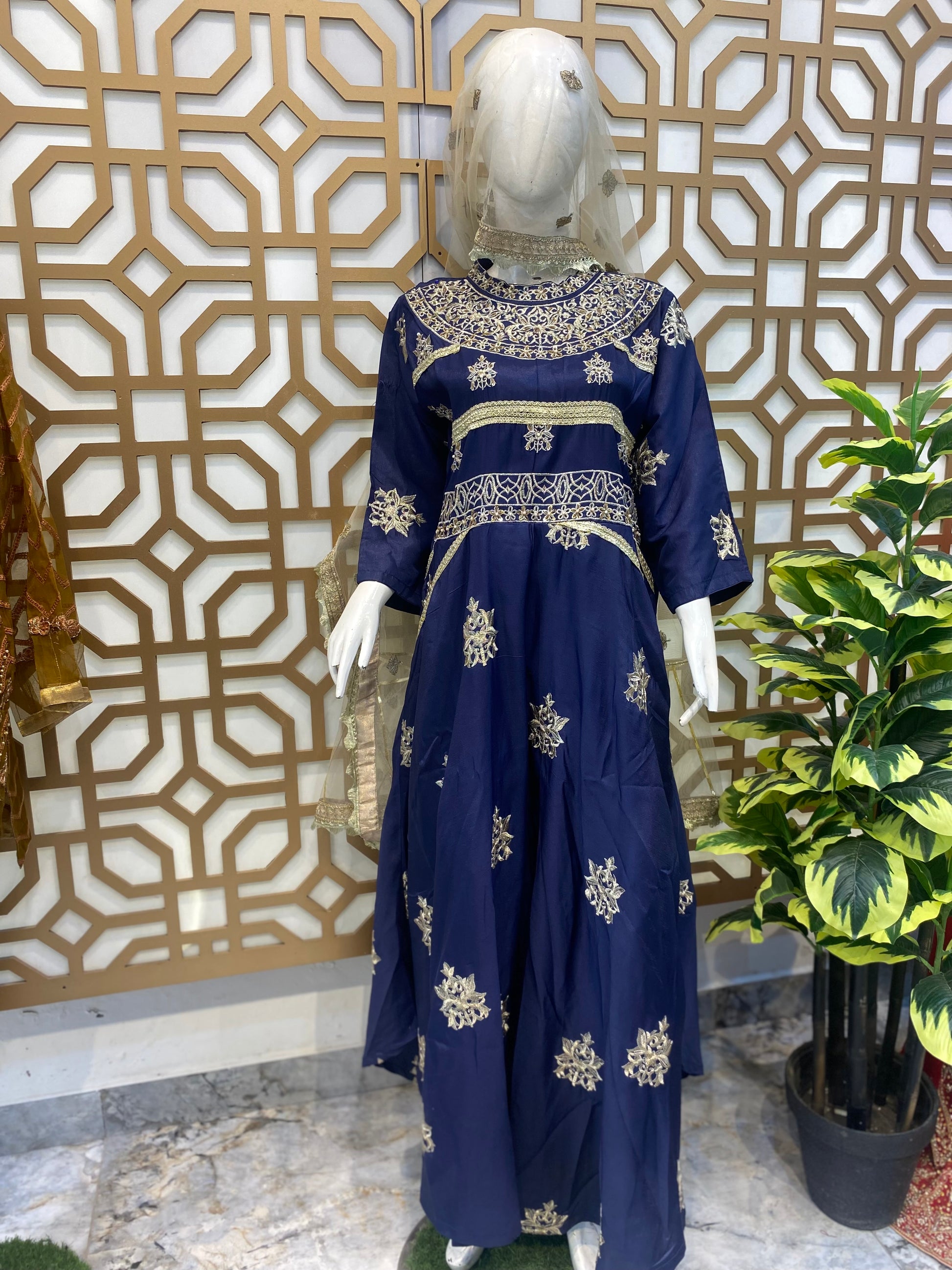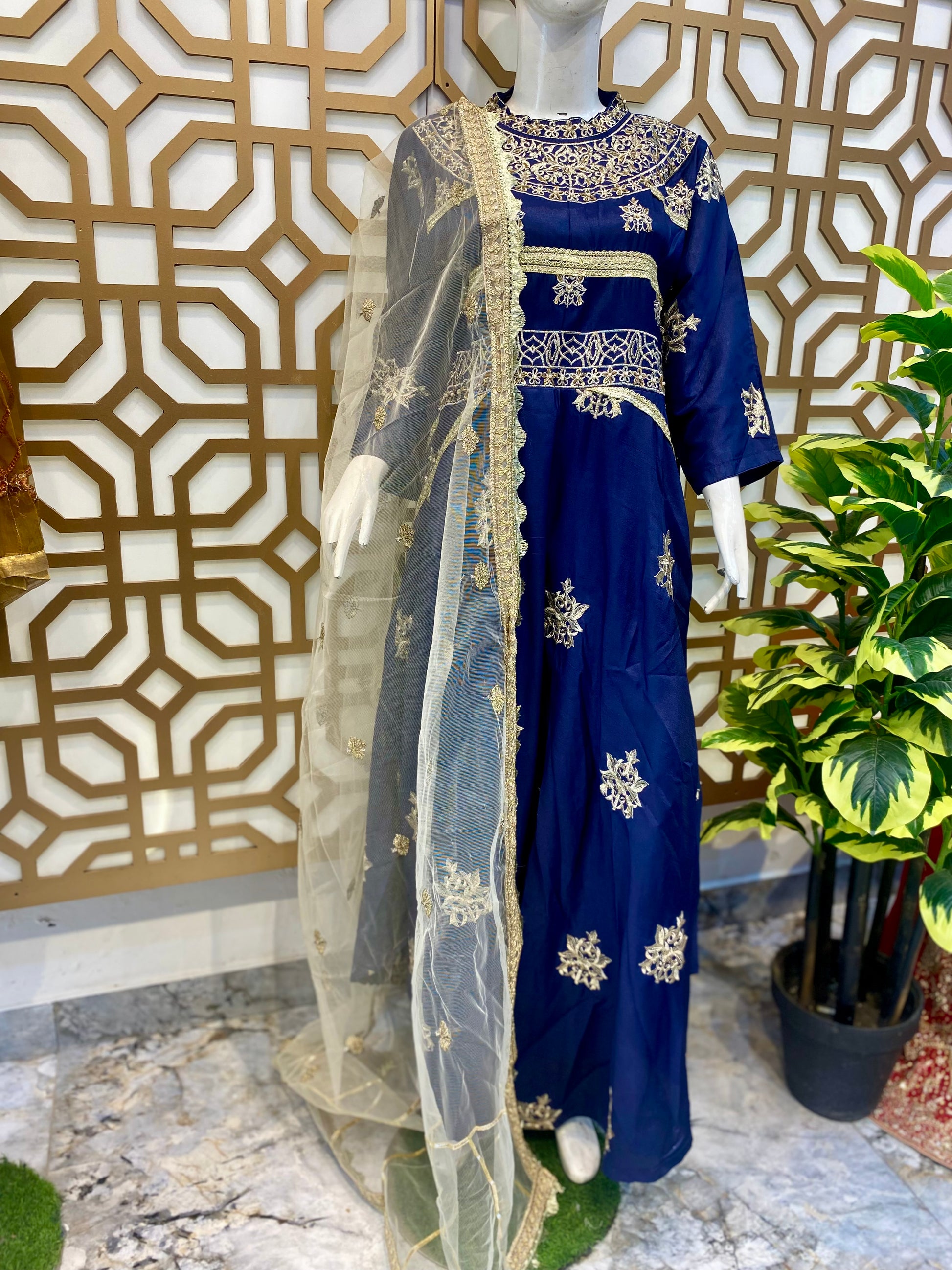An elegant navy blue long frock beautifully adorned with delicate embroidery, creating a timeless and graceful look. The rich color enhances its sophistication, while the detailed embellishment adds a touch of festive charm. Perfect for weddings, parties, and formal occasions, this outfit strikes the perfect balance between classic and contemporary style