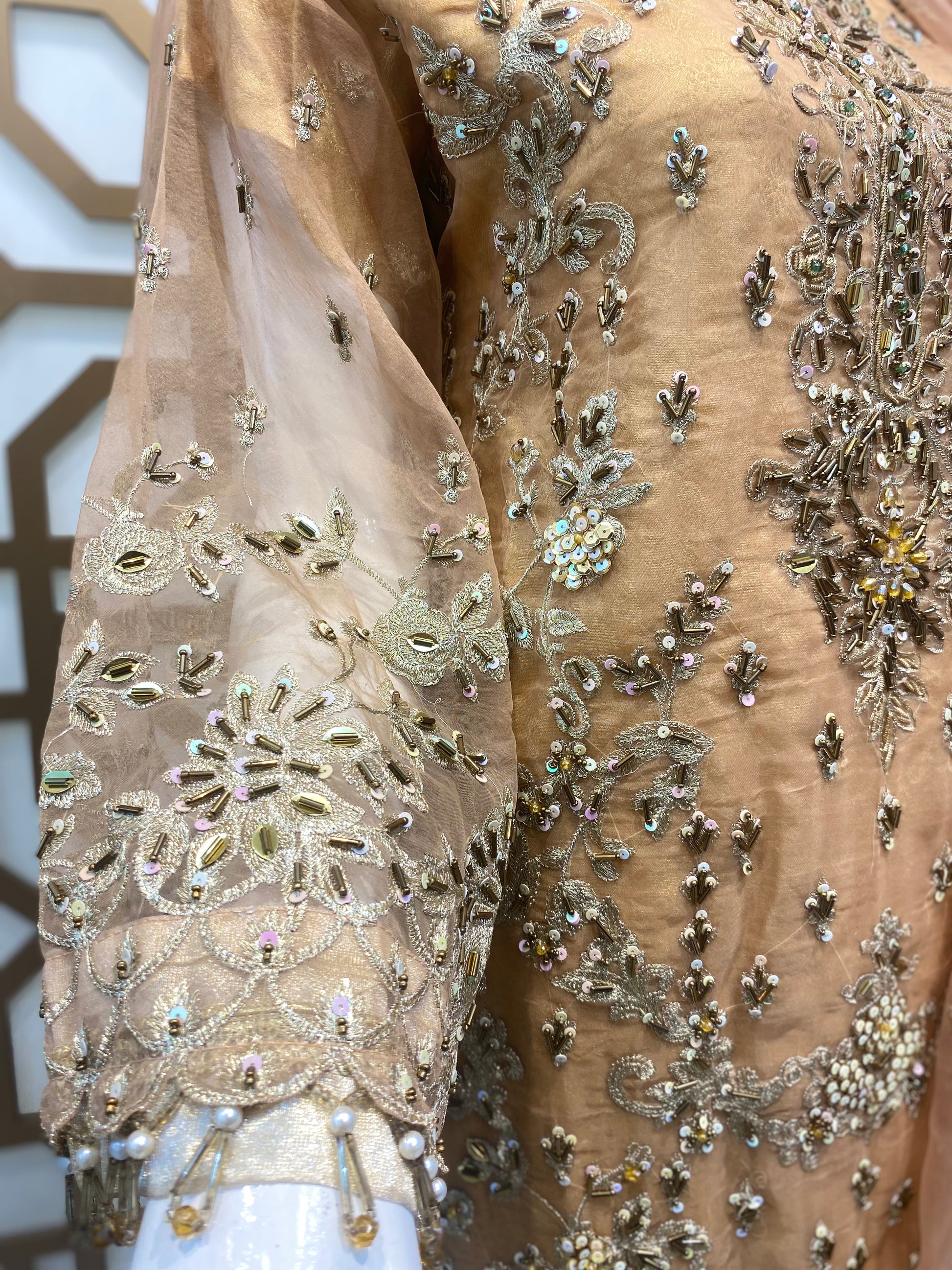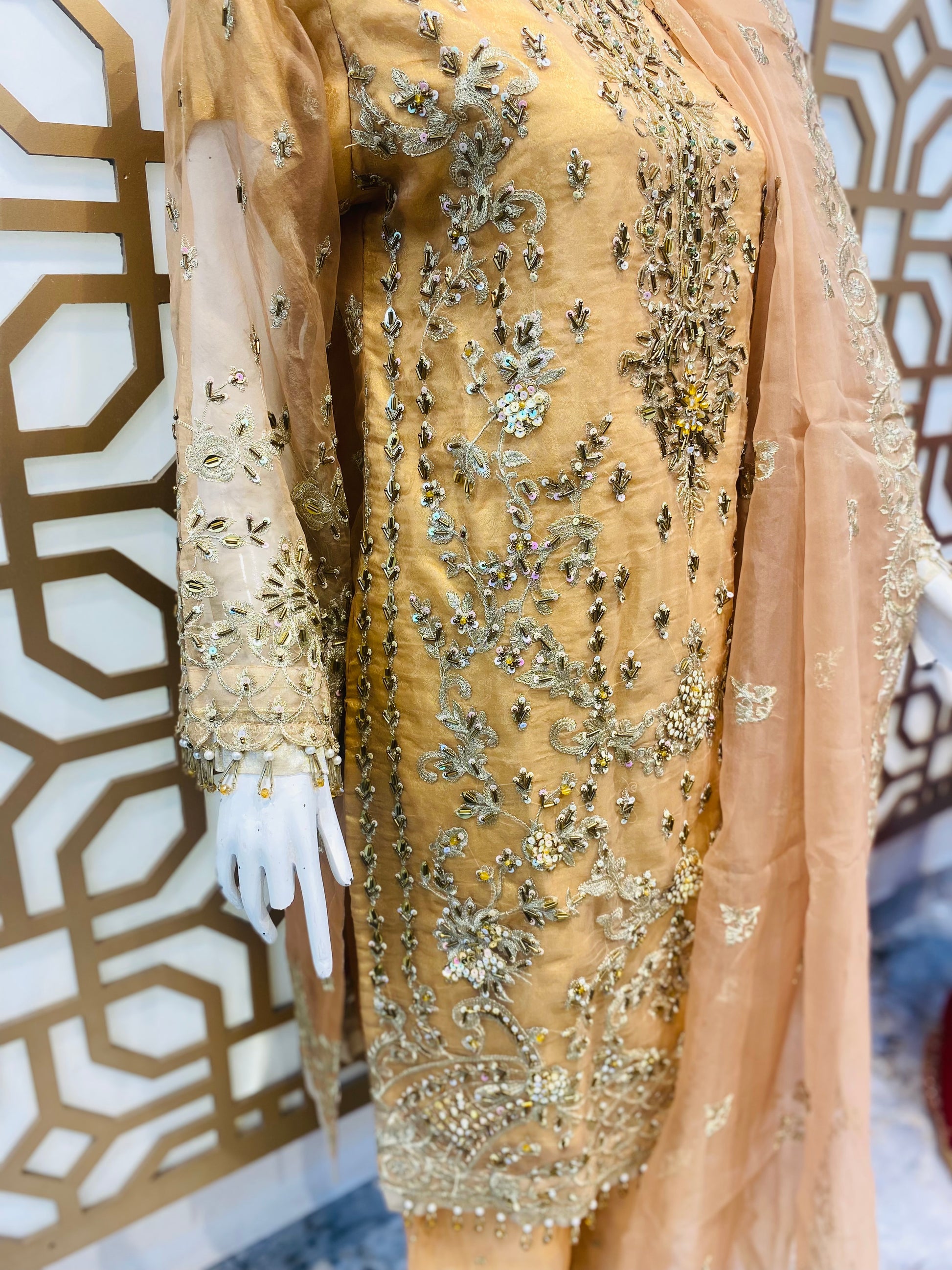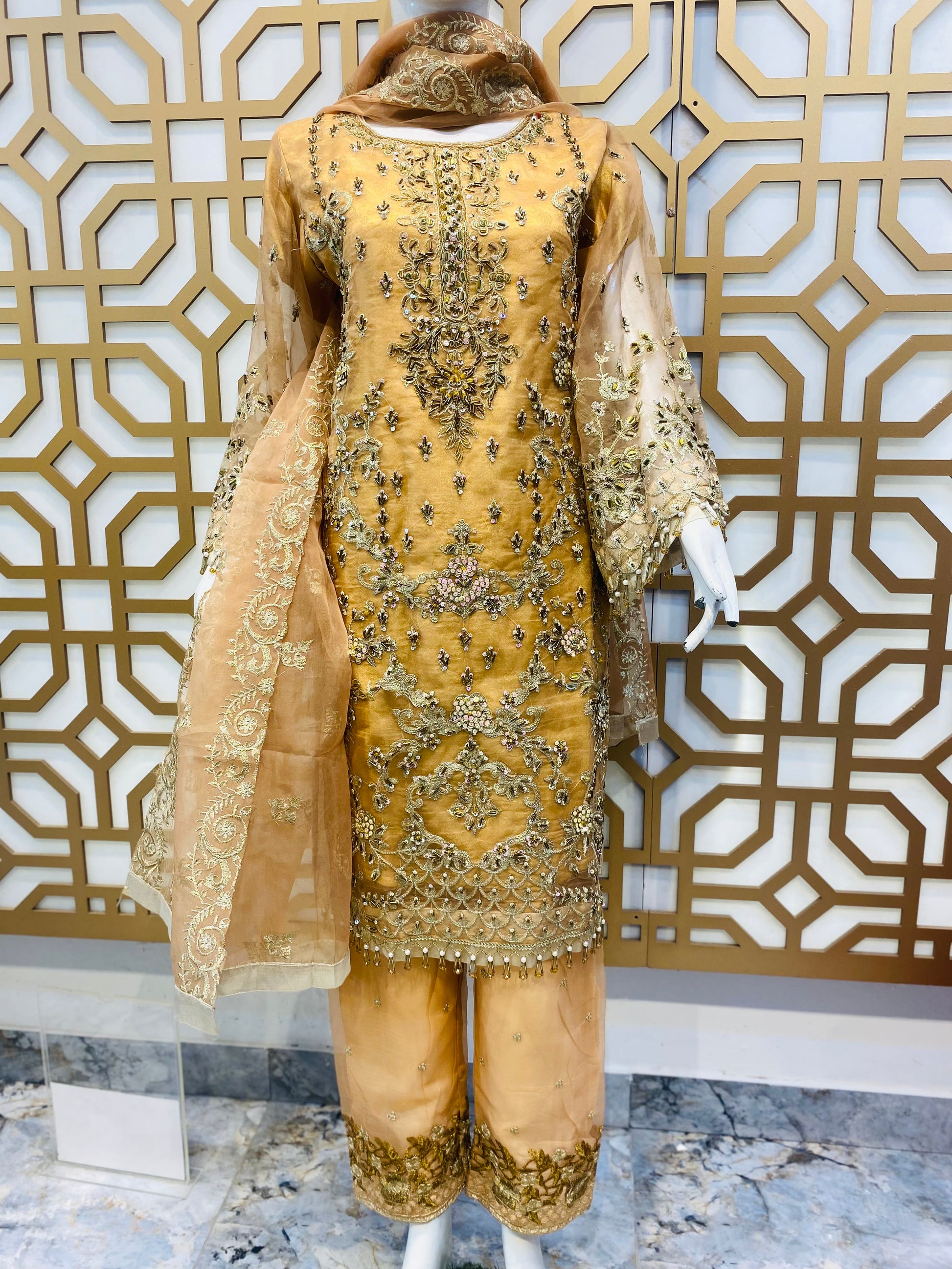 A stunning three-piece suit designed with full intricate embroidery, making it a true statement of elegance. The richly adorned shirt is paired with matching trousers and a graceful dupatta, creating a complete formal look. Perfect for weddings, parties, and festive gatherings, this ensemble blends traditional craftsmanship with timeless sophistication.