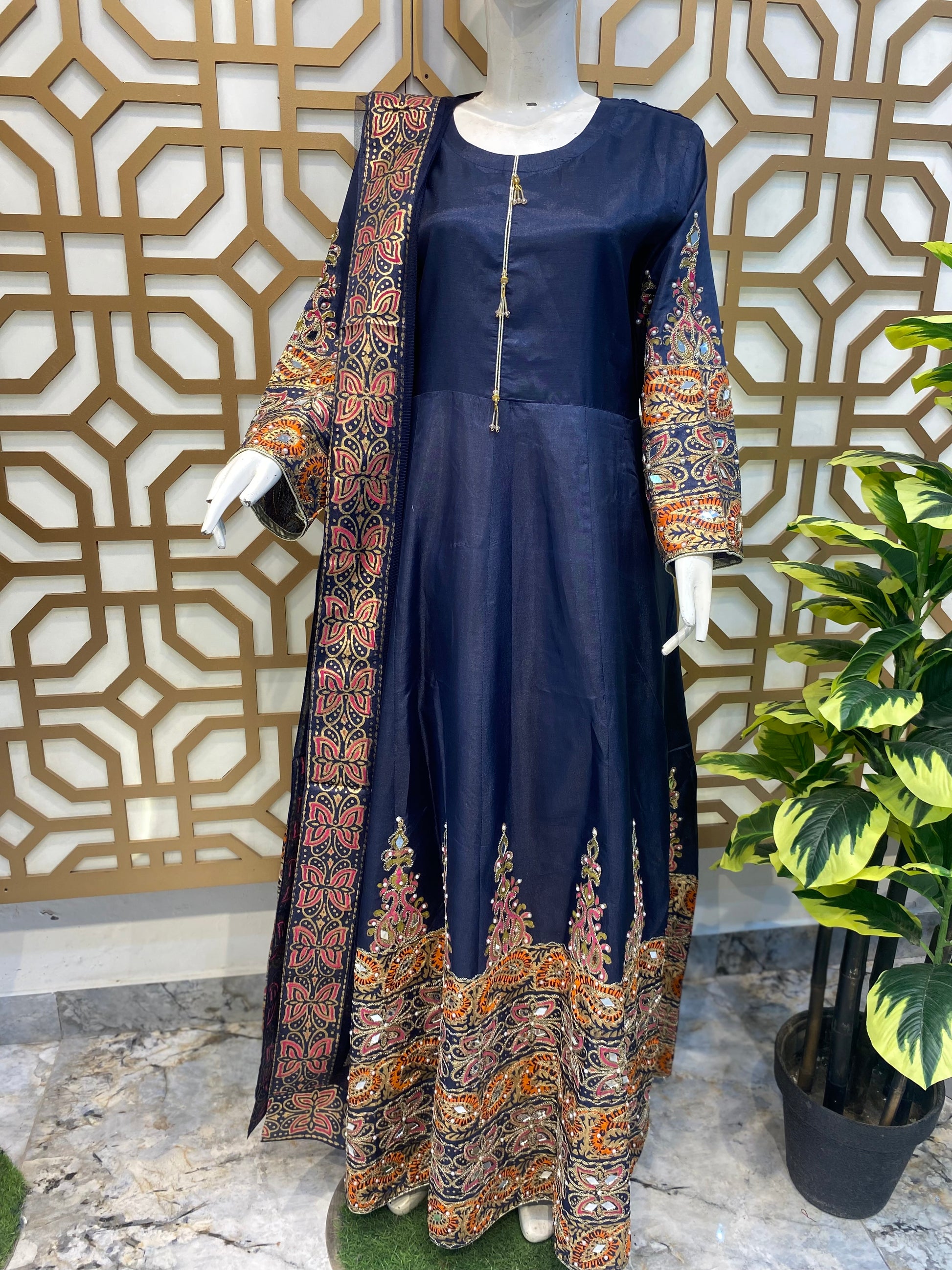 A graceful navy blue frock designed with a plain neckline for a touch of simplicity and sophistication. The border and hemline feature exquisite embroidery and handwork, adding richness and charm to the outfit. Paired with a soft net dupatta, this ensemble blends elegance with modern style — perfect for festive events, evening wear, or formal gatherings